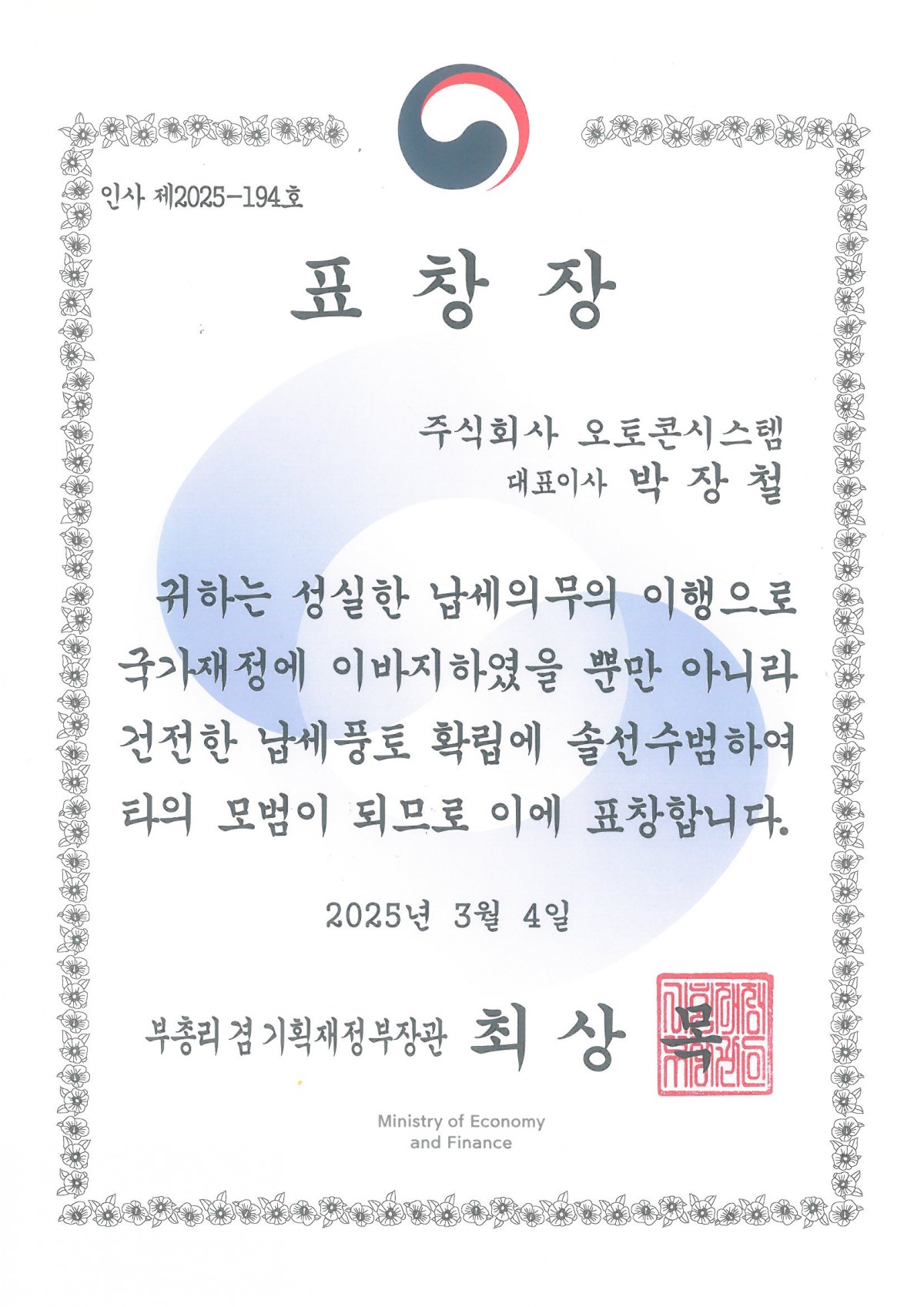 오토콘시스템이 받은 기획재정부장관 표창은 납세의무를 성실히 이행하고 일자리 창출, 사회공헌 활동 등을 통해 지역사회에 기여한 납세자에게 수여됩니다.